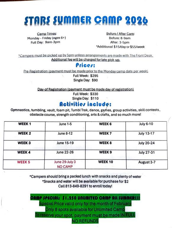 Methods of Payment: Card, Cash, Check, or our business VENMO @starsgymnastics ($4.00 transaction fee for VENMO payments)